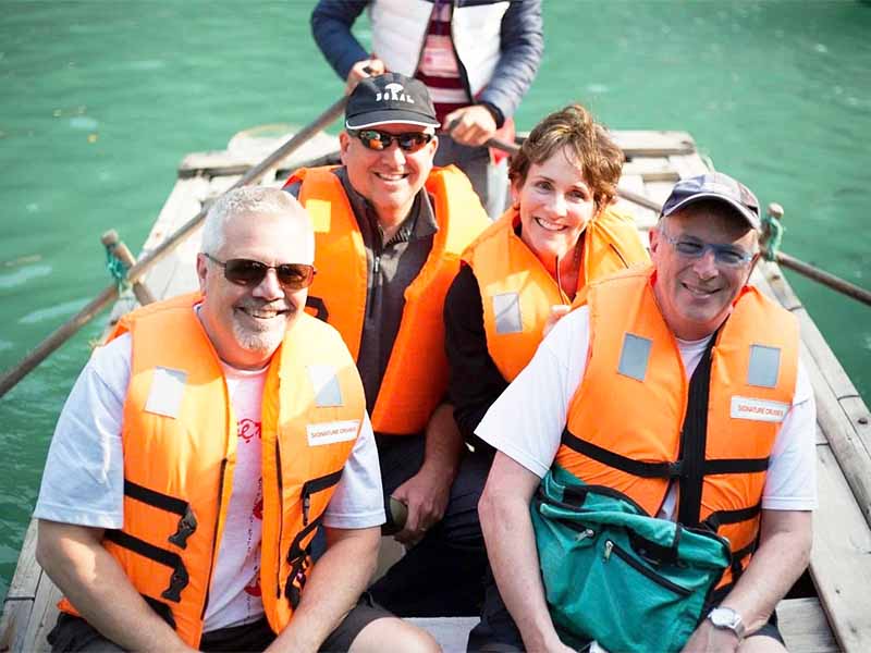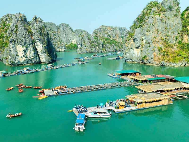 07:30 Sit on a bamboo boat to visit Vung Vieng floating village surrounded by mountains. We will trace our way among numerous floating houses and small rowing boats that are used in everyday life as vehicle, itinerant shops, fishing utility and even sometimes as an overnight shelter
